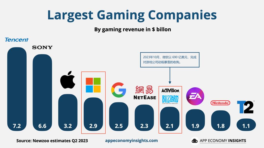 2023 年 Q2,微软(加上动视暴雪)游戏业务营收共计约 50 亿美元,成为全球营收第三大游戏公司,来源:App Economy