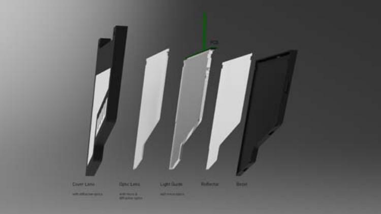 用于车辆尾灯的超薄、高性能的多功能灯模块。其原理是通过特定的微光学透镜(几微米大小,比盐粒还小)嵌入多层光学堆栈系统中发光。该光学系统厚度仅为5毫米,能够大幅减少车辆尾灯空间需求,通过提升车身结构刚性也能帮助提高车辆安全性。同时,高效率的光学系统能够让能源消耗降低80%。该系统能够提供均匀照明外观和多种多色车辆照明应用。