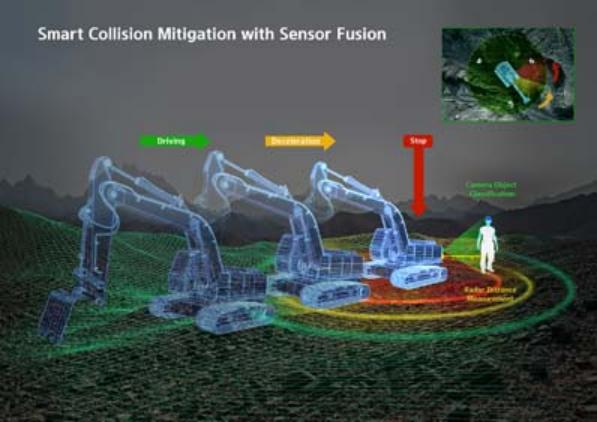 此外,使用三个具有180度水平视场角(FOV)的广角雷达传感器来最小化盲点,并准确测量检测到的物体距离。当在警告/危险区域内检测到物体时,会激活视觉/听觉警告,并且挖掘机会降低旋转和行驶速度然后停止运作,以主动预防事故发生。