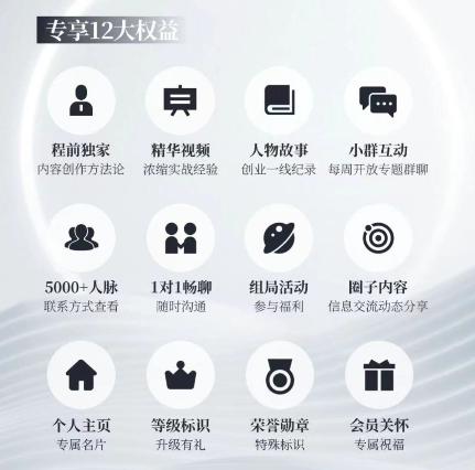 然后就是开始卖会员,记者查询发现, 程前的私域社群会员名为新火社区年度会员,售价2198元一年,购买的用户可以享受程前独家、小群互动、5000+人脉等12项权益,详情页介绍称,会员适用于想学习商业内容、正在创业、需要优质商业资源的人。