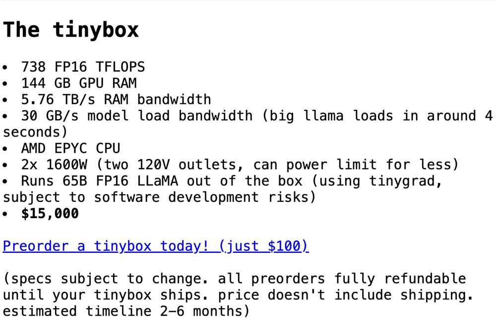 Tiny Corp成立于2022年5月,其创始人兼CEO是业界知名黑客“神奇小子”George Hotz,他也是自动驾驶创企Comma AI的创始人。2023年5月,Tiny Corp获得510万美元融资。