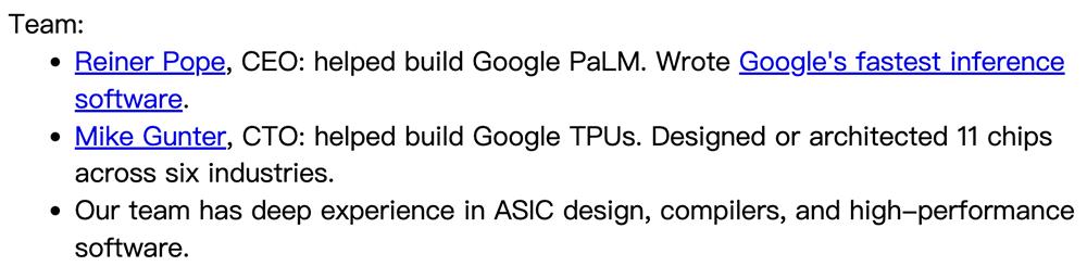 其CEO Reiner Pope参与构建谷歌PaLM模型,曾写出谷歌最快的推理软件;CTO Mike Gunter曾参与谷歌TPU工作。