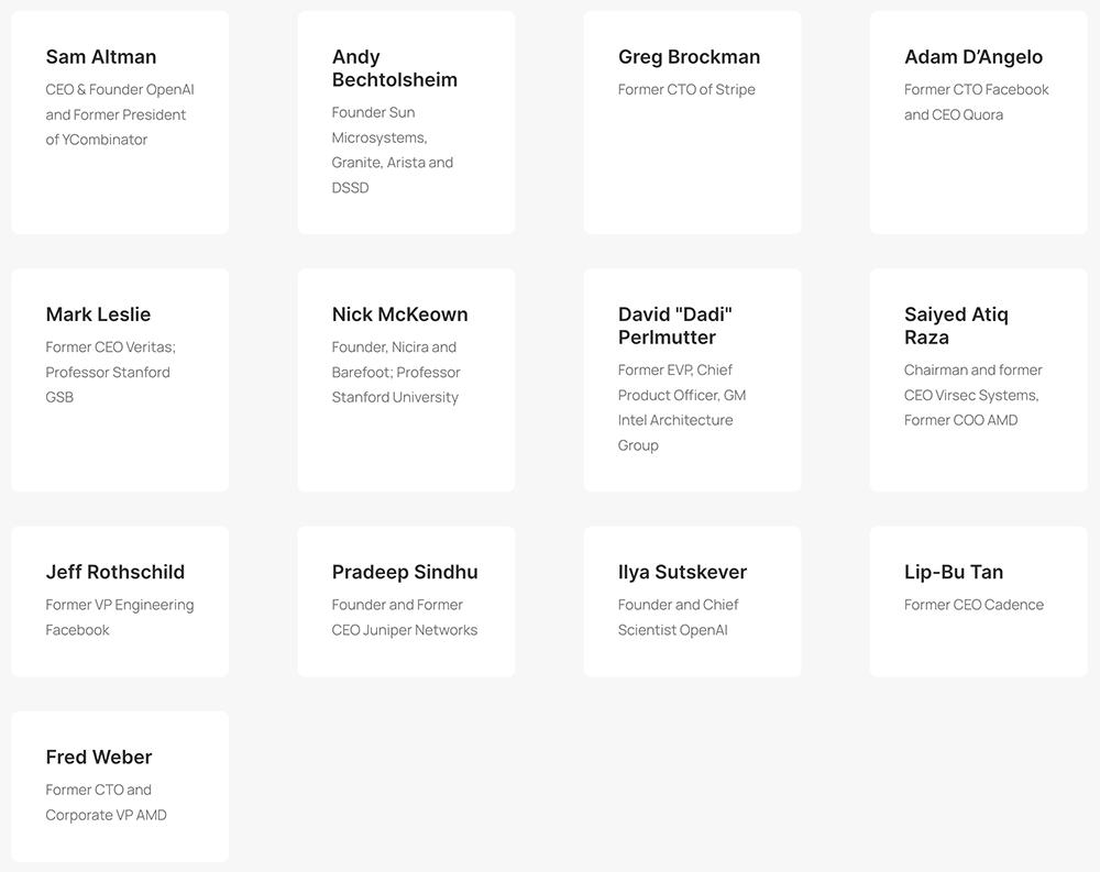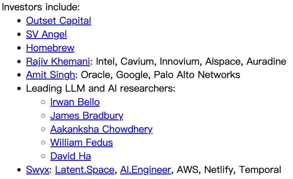 多位OpenAI联合创始人、Stripe前CTO、AMD前CTO兼总裁、Cadence前CEO等业界大佬都在其投资方阵容中。