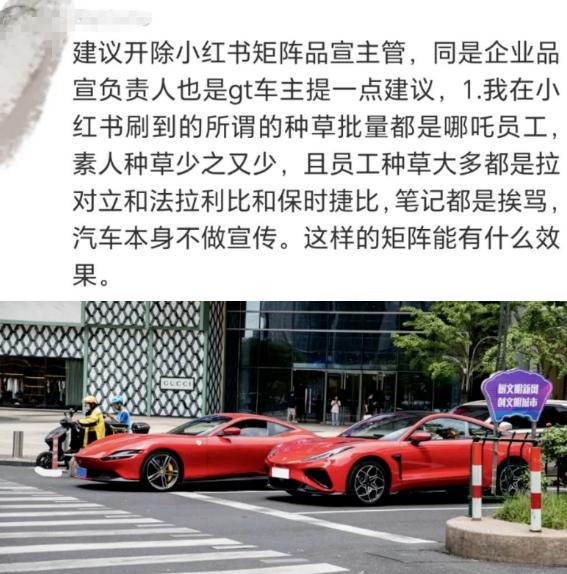 在小红书的官方账号下,还有车主建议开除小红书矩阵品宣主管,认为哪吒汽车大多笔记都在跟法拉利与保时捷对比,定位完全不同很难种草。