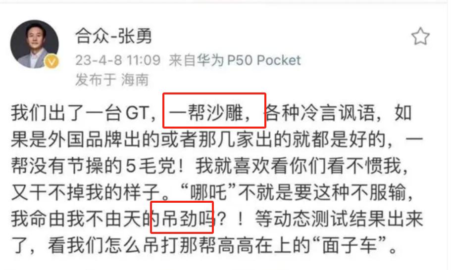 直到哪吒GT发布,张勇才一改“内敛”形象,开始在微博上打造类似李想、余承东那样的大嘴、张狂形象。