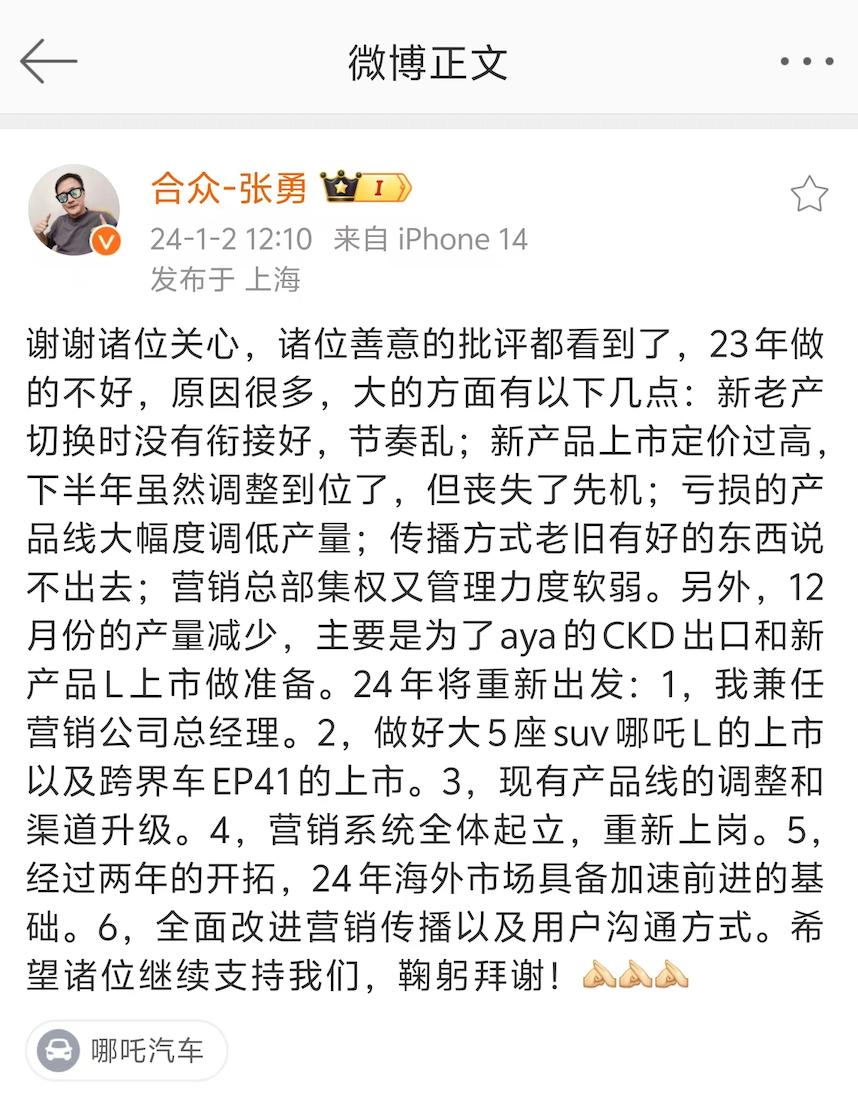 痛定思痛的哪吒汽车CEO张勇在微博求网友"支招",还在开年之初进行了人事变动,砍掉了营销部的两员大将。
