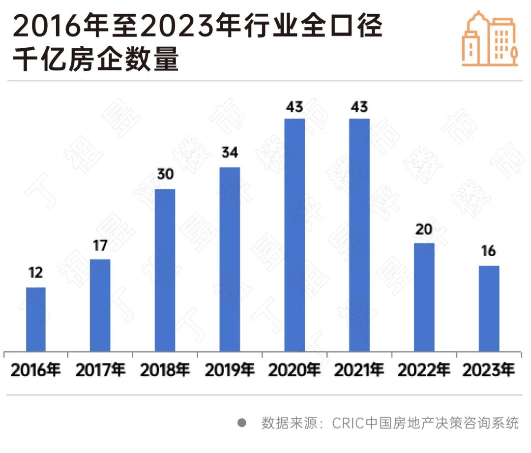 自2010年万科成为第一家千亿房企以来,房地产行业经历了长达十多年的黄金时代,2021年起行业进入调整期,与此同时,千亿房企数量也随之从峰值逐渐回落,2022年千亿房企只剩下20家,较2021年峰值减少了23家。2023年千亿房企数量在去年“腰斩”的基础上进一步下滑,最终仅16家企业保持千亿规模。