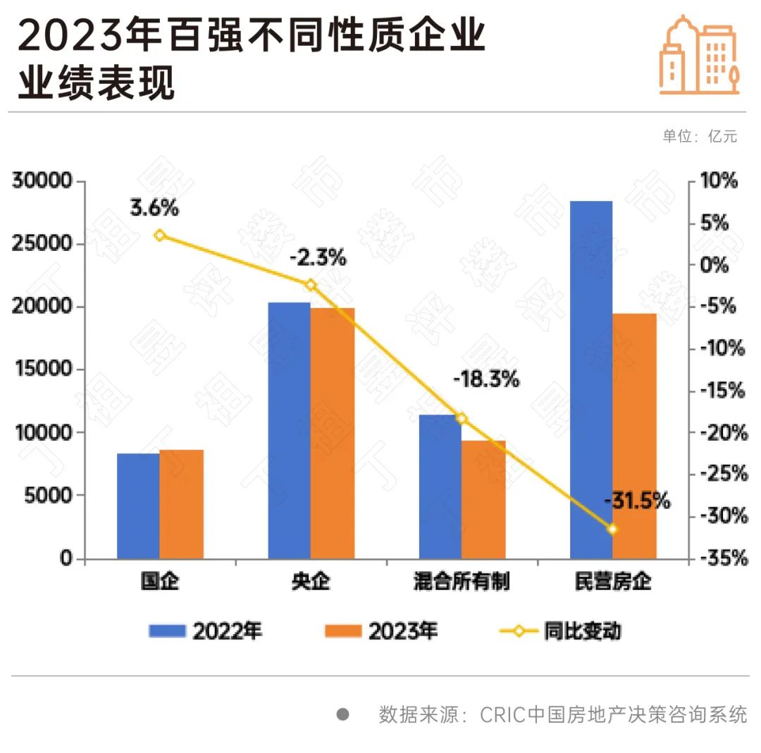 深度分化是当前楼市最为重要的特征,在行业深度调整之下、百强房企格局分化持续,央国企销售表现显著好于混合所有制房企和民营房企。