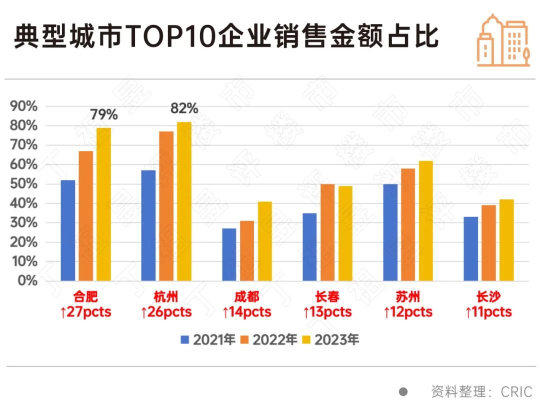 从销售情况来看,部分城市集中度也在加速攀高。CRIC数据显示,典型城市TOP10企业销售金额占比出现明显提升,如合肥TOP10企业销售金额占比从2021年的52%提升至2023年的79%,累计提升27pcts,杭州TOP10企业销售金额占比也从2021年的57%提升至2023年的82%,累计提升26pcts。