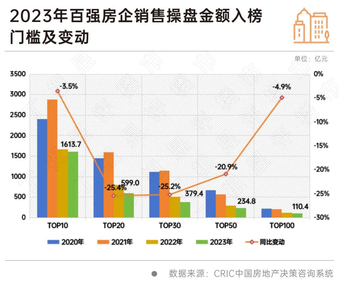 从不同梯队房企销售门槛值的变化来看,TOP10房企保持了较高的发展韧性,销售操盘金额门槛为1613.7亿元,同比降低3.5%;TOP20和TOP30梯队房企格局变动加剧,门槛分别同比降低25.4%和25.2%至599亿元和379.4亿元。TOP50门槛降低20.9%至234.8亿元,TOP100门槛降低4.9%至110.4亿元。
