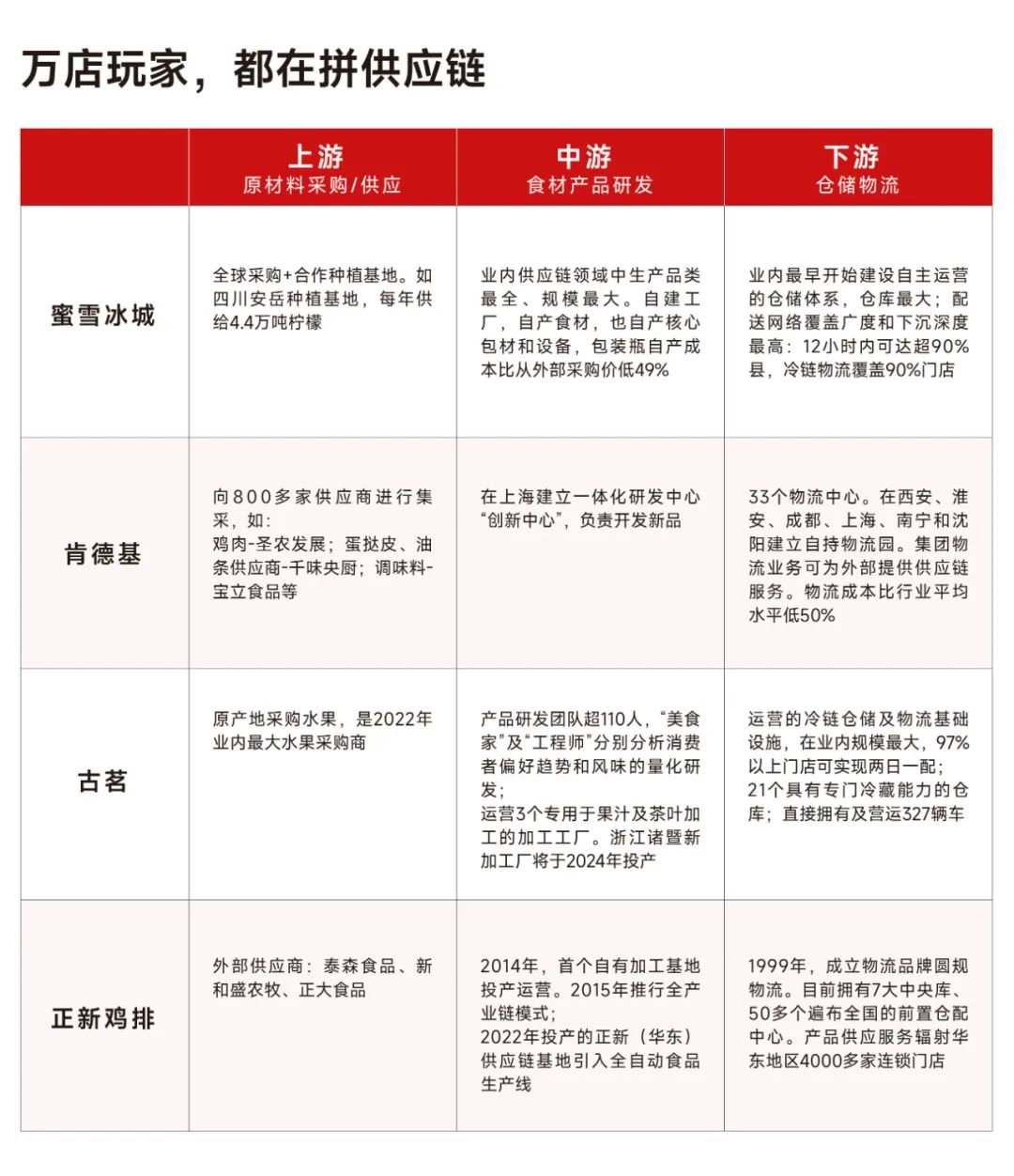 其中,蜜雪冰城比较特殊,它介于新老万店时代之间——有旧玩家“小吃小喝”的特性,相比其它新茶饮品牌,它的SKU不多、上新速度也不快;但在品牌营销、供应链与数字化的布局上,都呈现出了新万店玩家们的特征。