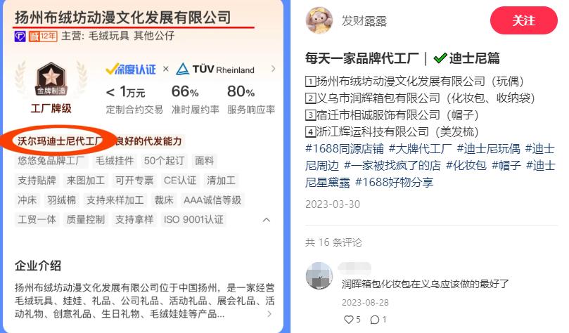 其实也用不着太费劲扒,反正每个迪士尼玩偶背上都扎着好几页产品信息,哪个厂来的写得清清楚楚,上1688一搜就是。