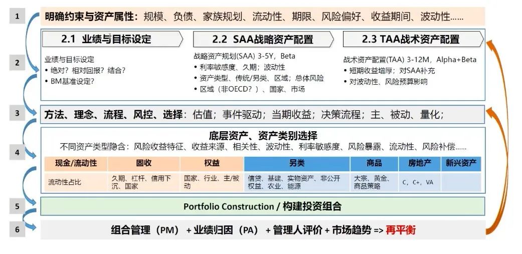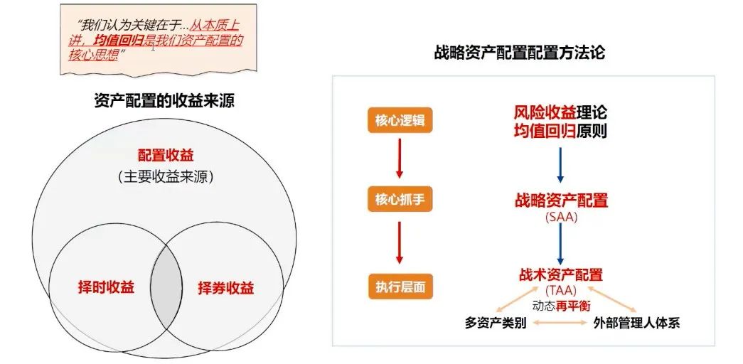 其中,核心抓手是战略资产配置SAA,表现在执行层面就是战术资产配置TAA,通过对不同资产配置和不同外部管理人的选聘和配置,再结合再平衡,来达到TAA和SAA的最终目的。