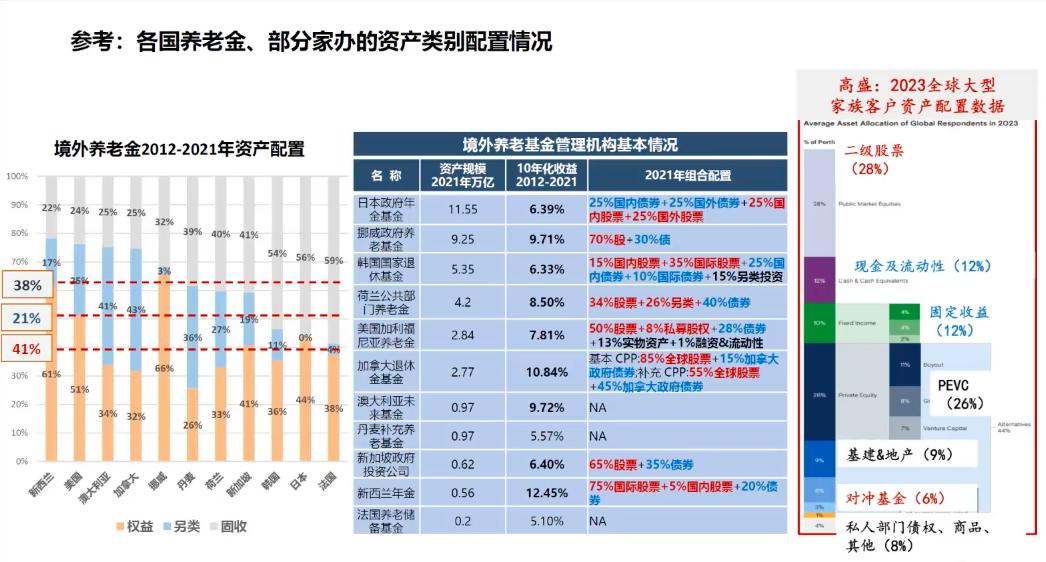在这个图中,大家可以看到各国养老金、高盛服务的全球主要家族办公室的资产配置与各类资产的比重。