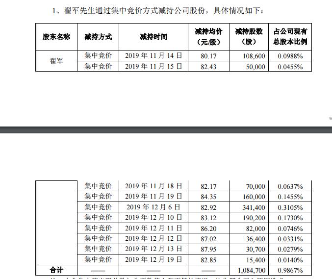 彼时,翟军减持均价超过80.17元,即套现金额超过8600万元。2019年10月份抛出减持计划时,翟军的减持目的为“个人资金需求”。