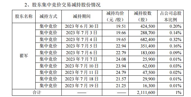回顾历史公告,在2023年6月30日至2023年7月19日期间,翟军通过集中竞价方式累计减持公司股份2111600股,占公司总股本的1%。