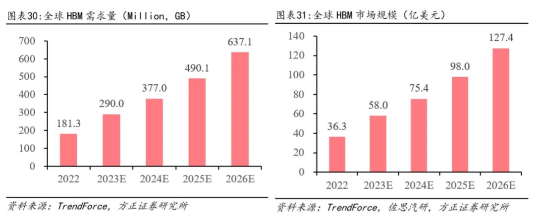TrendForce预估,2024年全球HBM的位元供给有望增长105%;HBM市场规模也有望于2024年达89亿美元,同比增长127%;预计至2026年市场规模将达127.4亿美元,对应CAGR约37%。
