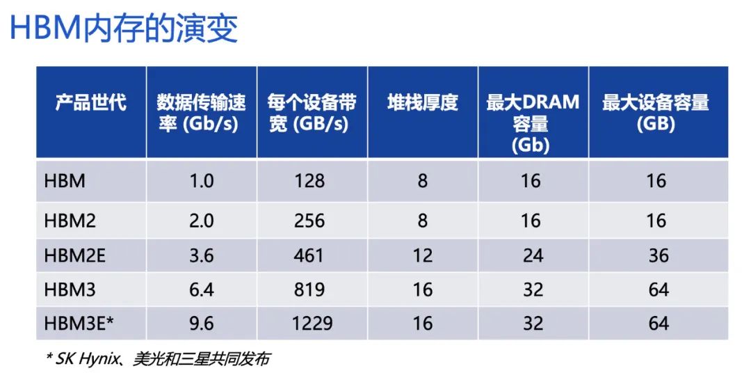 其实HBM应用已有几年的时间,自2014年首款硅通孔HBM产品问世至今,HBM技术已经发展到第五代,其中HBM3E是HBM3的扩展版本,依次类推,HBM4将是第6代产品。从HBM内存的演变来看,最新的HBM3带宽、堆叠高度、容量、I/O速率等较初代均有多倍提升。