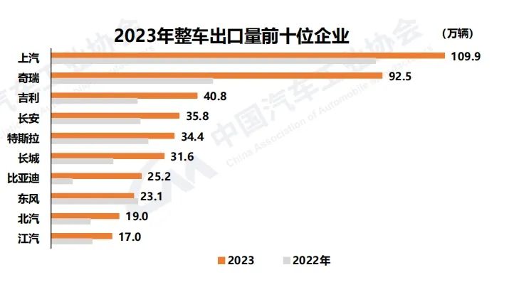 2023年,整车出口前十企业中,上汽集团以109.9万辆的出口成绩领衔,紧随其后的是奇瑞和吉利,出口量分别为92.5万辆和40.8万辆。而从增速来看,比亚迪出口25.2万辆,同比增长3.3倍;奇瑞出口同比增长1倍;长城出口31.6万辆,同比增长82.5%。