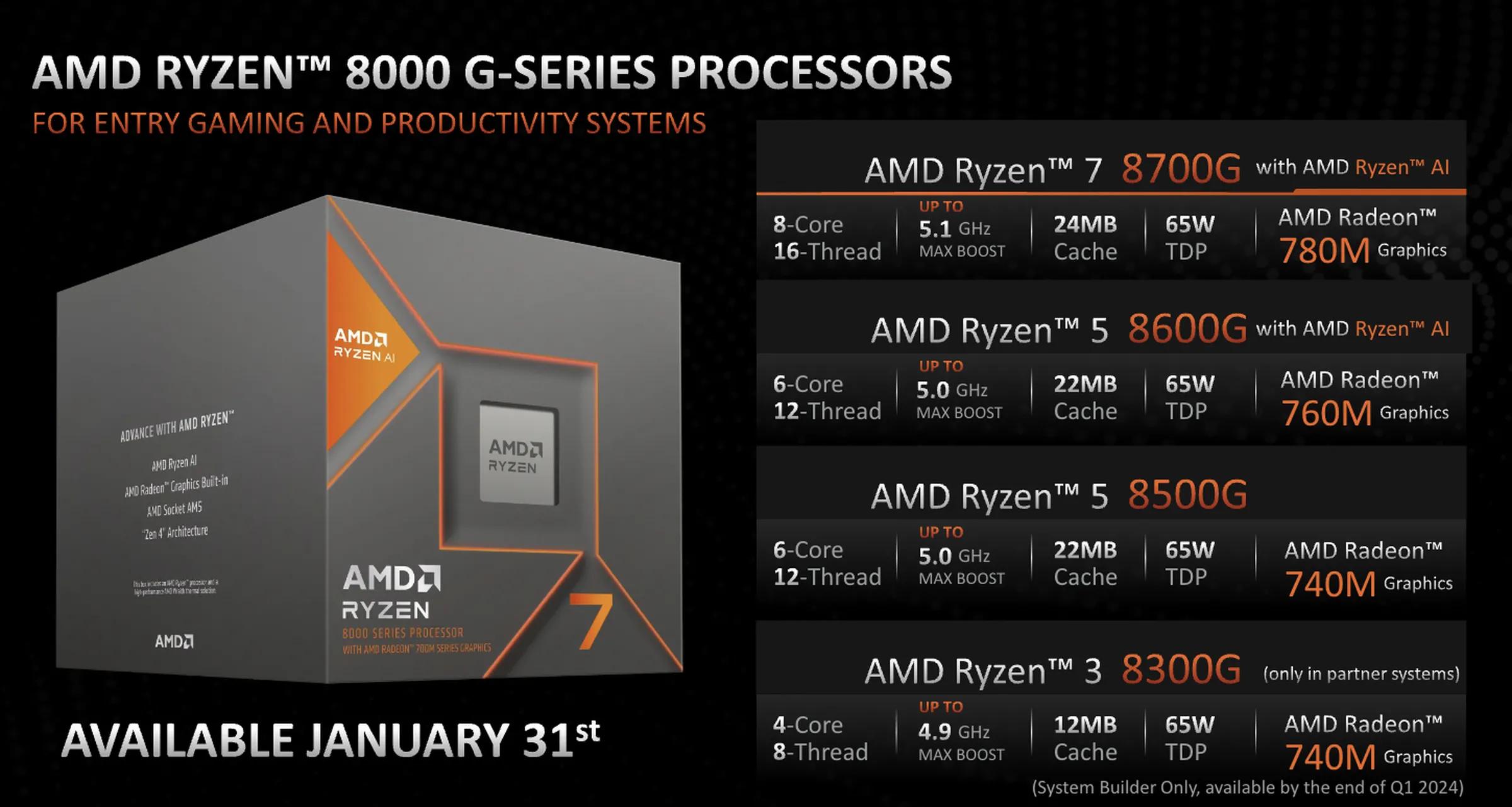 此次AMD一共发布了四款型号,分别R7 8700G、R5 8600G、R5 8500G和R3 8300G,其中最高配的R7 8700G采用更大面积的Phoenix核心,搭载Radeon 780M(12CU)核显。