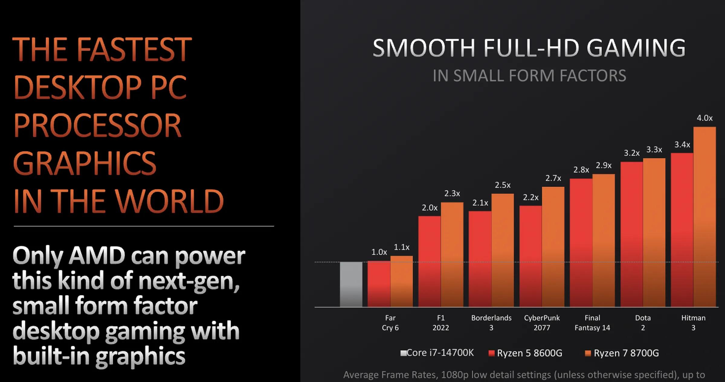 不过放在桌面市场的话,在英特尔这边多年原地踏步的情况下,可以预见锐龙8000G系列APU都会拥有着性能最强的桌面端核显,不需要独立显卡带来了更少的功耗和发热,对于Mini PC来说无疑是不错的选择。