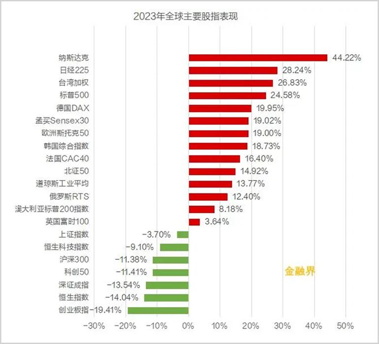全球主要股指82%在2023年录得上涨,仅18%下跌,而A股上证指数全年下跌3.7%,创业板指全年下跌逾19%。