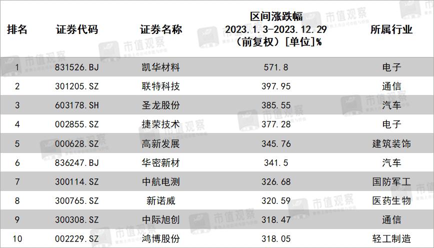 2023年十大牛股第一名归属于在北交所上市的凯华材料,全年涨幅超过5.7倍。也是全年唯一一只涨幅超过5倍的股票。