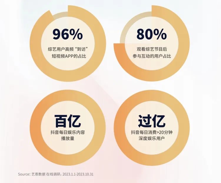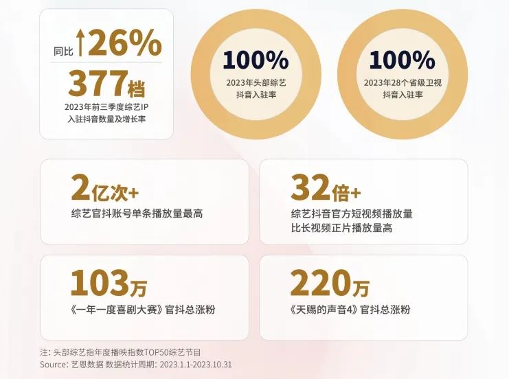 虽然整体在下降,但与之相对应的是,台网综艺入驻抖音宣发的数量却在上升,2023年前三季度入驻抖音的综艺IP共计377档,同比增长26%,实现头部综艺的全覆盖。