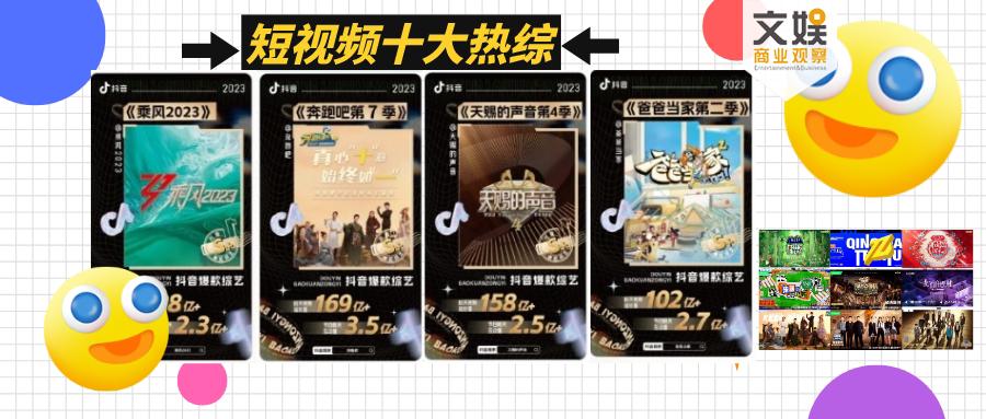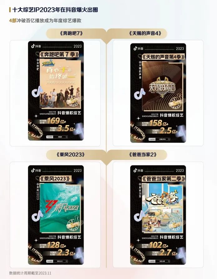 在《抖音综艺宣发白皮书》中,十大综艺IP在抖音爆火出圈。这其中,4部在抖音冲破百亿播放的成为了年度综艺爆款,分别为《奔跑吧7》《天赐的声音4》《乘风2023》《爸爸当家2》。