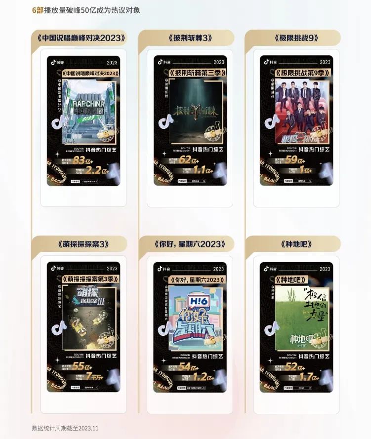 除了这四部之外,还有六部播放量破峰50亿的热议综艺。分别为《中国说唱巅峰对决2023》《披荆斩棘3》《极限挑战9》《萌探探探案3》《你好,星期六2023》《种地吧》。