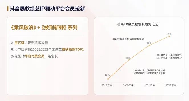 而在《抖音综艺宣发白皮书》中也举了一个案例。来自芒果TV的爆款综艺,也在抖音等短视频平台的助力下,驱动平台会员拉新。《乘风破浪》+《披荆斩棘》系列均百亿级抖音话题播放量,助力节目摘得2020&2022年度综艺播映指数TOP1,双轮驱动平台付费会员一路增长。