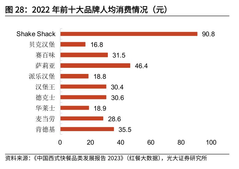红餐大数据发布的《中国西式快餐品类发展报告 2023》显示,人均消费在40元以下的品牌数占比已经超过92%,相比2021年度有所提升;其中人均20元以下的品牌数占比63.5%。