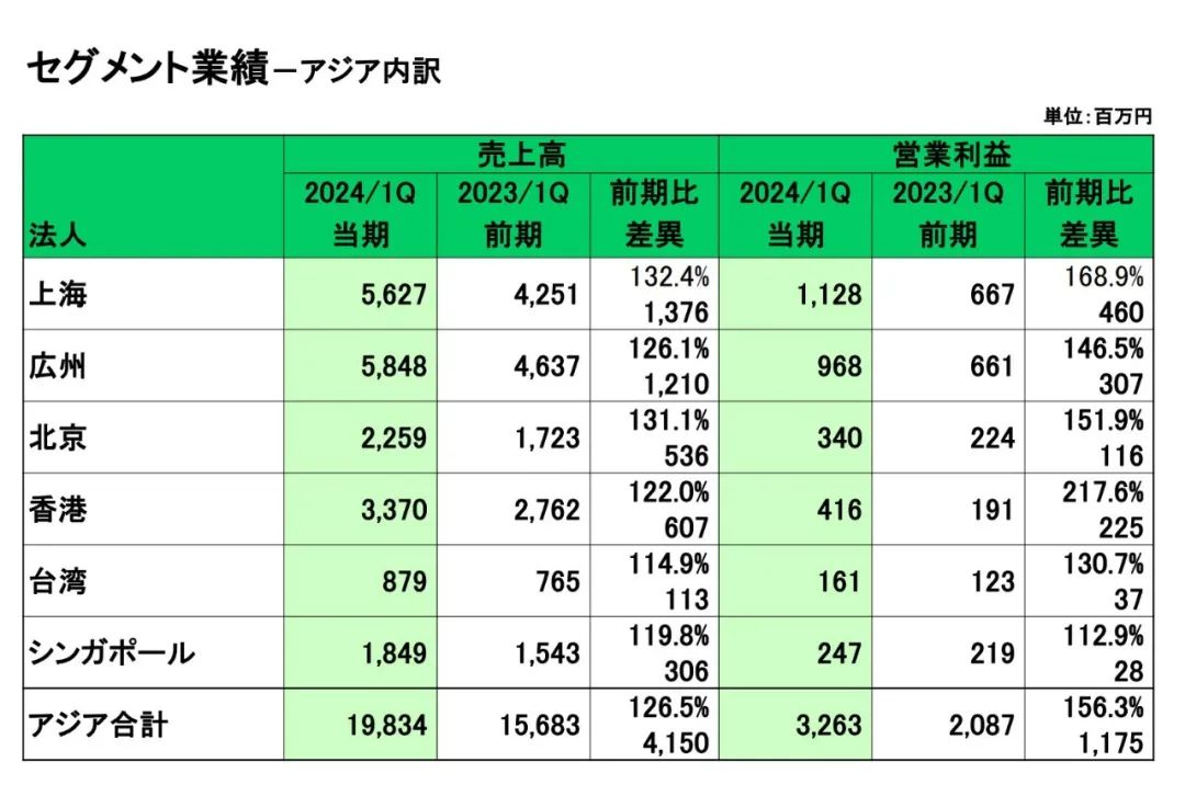 其中,上海一地的销售额为56.27亿日元(约合人民币2.77亿元),同比增长32.4%,经营利润为11.28亿日元(约合人民币5553万元),同比大涨68.9%;广州的销售额达到58.48亿日元(约合人民币2.87亿元),同比增长26.1%,经营利润为9.68亿日元(约合人民币4765万元),同比增长46.5%。