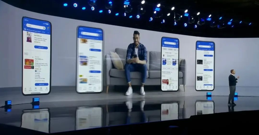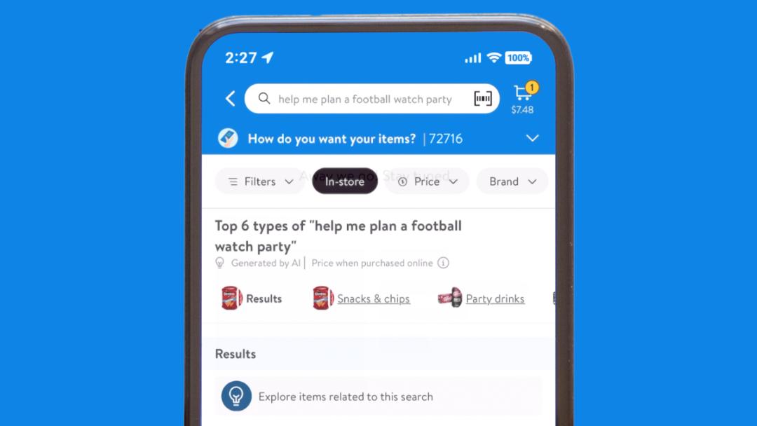 所以,现在你可以搜索场景或情况来查找相关产品,而不是搜索特定品牌了。例如,如果在沃尔玛App中输入“请做一个足球观赛派对计划”,它就会给你推荐薯片、鸡翅、饮料甚至90寸的电视机等产品。