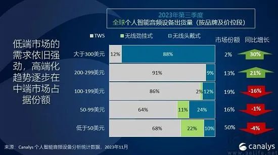 日前,调研机构Canalys发布了2023年第三季度全球智能个人音频市场报告,显示该季度智能个人音频产品全球出货量达1.1亿台,并且由于在大众市场的持续渗透,TWS耳机已占总出货量的73%。同时凭借着更为亲民的价格,TWS耳机在中低端市场持续下潜,取得了更多的市场份额。
