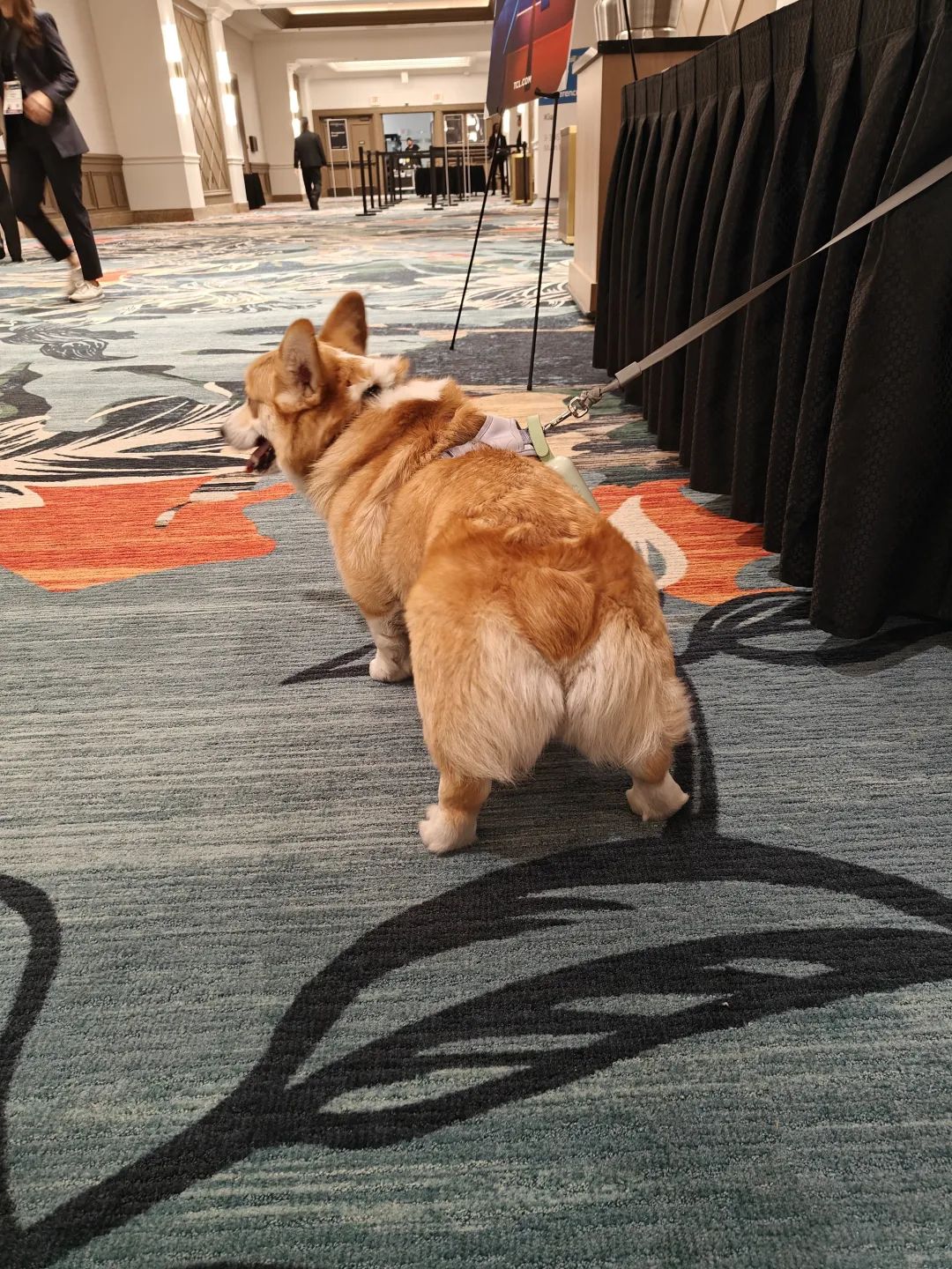 嗯。。。结果这只柯基自己把绳子咬断了在酒店里乱跑, TCL 的人在后面追,第二天就没带过来了。。。