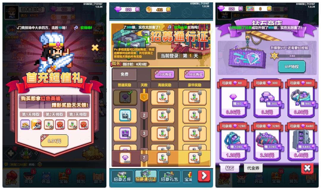 该游戏主打“低价策略”: 首充礼包0.01元;通行证0.98元;常规充值0.06元起步,6.48元封顶;