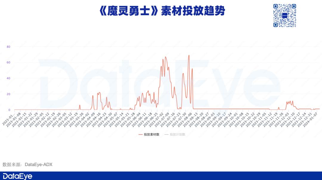 投放量方面,DataEye-ADX数据显示,《魔灵勇士》在2023年4月及7月份有两次素材投放高峰,但单日素材投放量也仅有两位数。