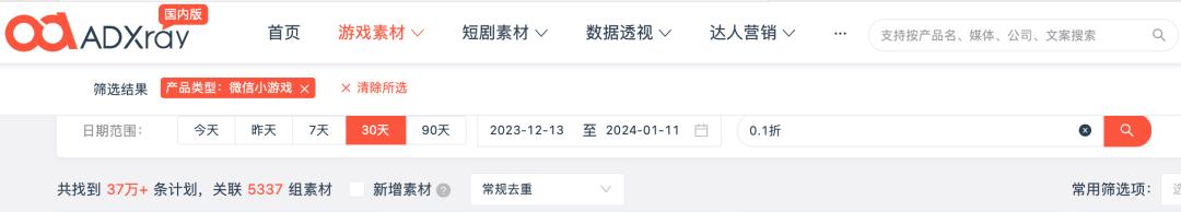 以上都非个例,DataEye-ADX数据显示:截至1月11号的近30天,买量标题文案中带“0.1折”的微信小游戏创意素材,视频+图片已高达5337个,对应37万+的计划数!