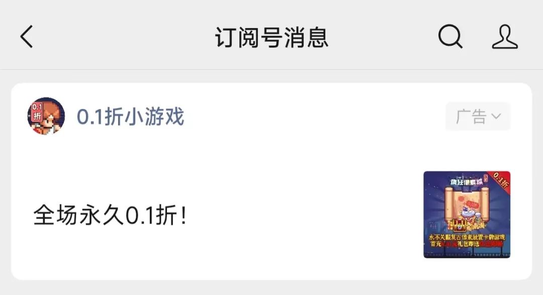 从玩家角度看,0.1折的噱头、低价策略,对于玩家是观念上的直接影响。玩家会认为:小游戏,就是低质内容,就应该“不花钱”、“少花钱”,“0.1折才是良心”——这是一种刻板印象、错误观念。