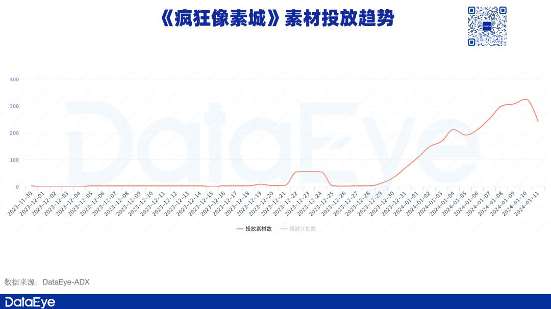 投放量方面,DataEye-ADX数据显示,《疯狂像素城》从今年1月1日起,素材投放量逐渐飙升,突破三位数。1月10号单日视频+图片已超过400。