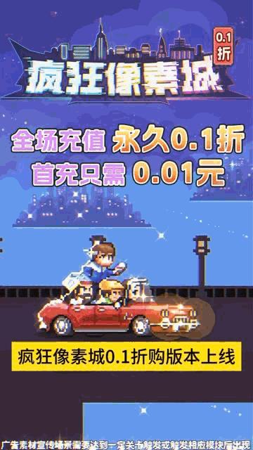素材创意方面,《疯狂像素城》的投放素材,均是以“0.1折”、“一分钱拿下诸葛亮”、“超多福利、拒绝氪金”等文案为主要信息。