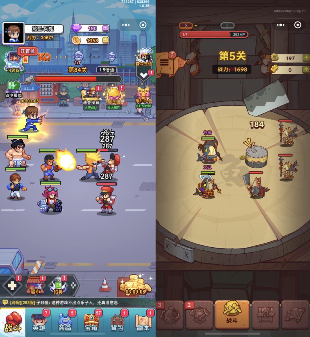产品方面,《疯狂像素城》与《咸鱼之王》的玩法和系统,有较多相似之处。都是挂机卡牌,点击屏幕攻击,同样拥有开宝箱抽取英雄、强化装备、副本挑战等RPG玩法。 同时,该游戏中角色,蹭了忍者神龟、街霸、拳皇、龙珠、漫威、三国、西游等IP。
