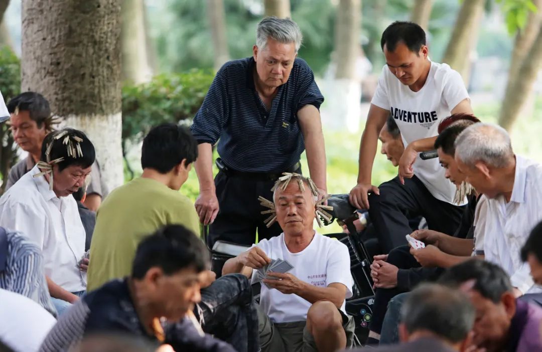 2015年4月21日,广东中山。一群老人在公园里打牌,输牌的人的头和耳朵上夹满了夹子。(图/视觉中国)