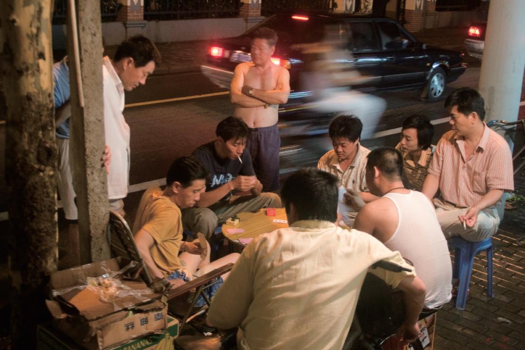 2005年6月29日,上海。在南昌路路边打牌的人。(图/视觉中国)