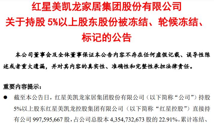 1月11日晚,美凯龙公告,持股5%以上股东红星控股及其一致行动人车建兴、陈淑红股份发生冻结。