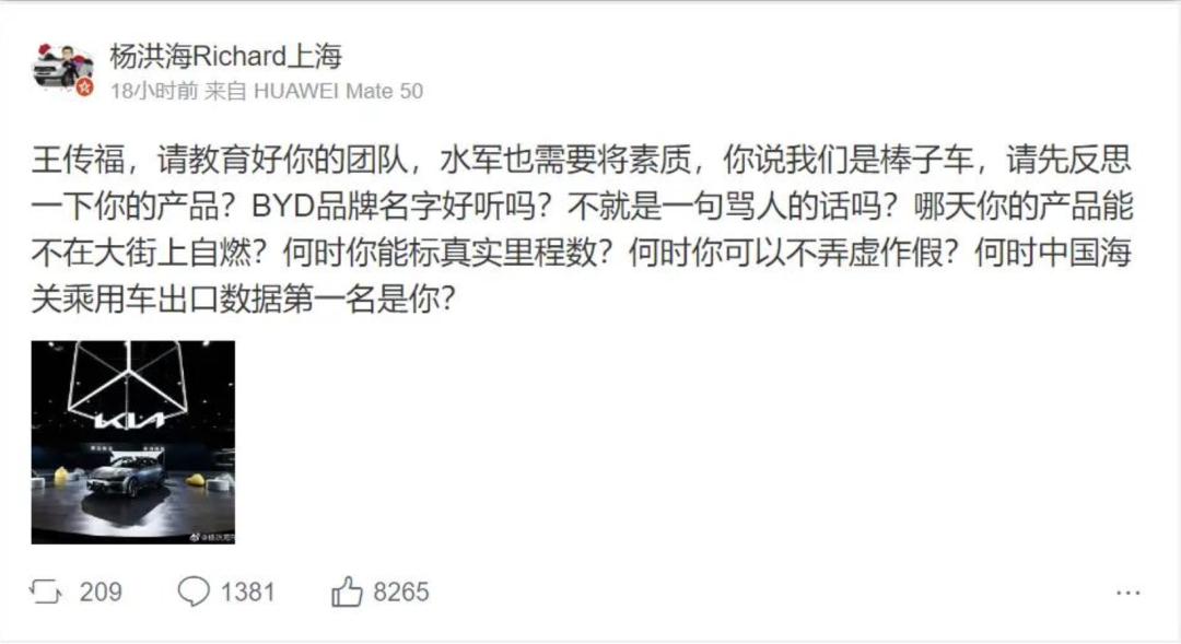 另外,尽管有人说杨洪海此举是为新车上市博眼球,但笔者却把吃瓜的重点放在了杨的一连串反问上。杨总监一边说王传福称起亚为“棒子车”,一边主动出击BYD品牌也是一句骂人的话,让人哭笑不得。嗯~,果然是做生意的,主打一个对称输出不吃亏。