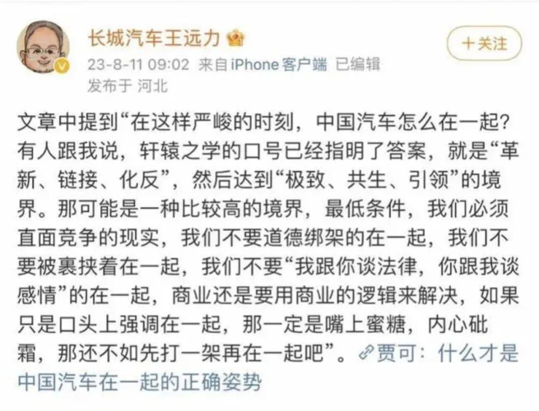 而血战之前先开骂战,流血之前先吐口水。高管们身处血色乱世,情绪总归是处于紧绷的状态。当初春秋战国那么乱,不也出现了思想与文化上的百家争鸣么,现在车圈竞争激烈人心不稳,大家打打口水战,引领一下文化思潮怎么了?