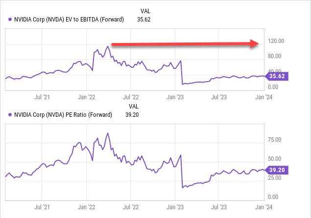 在 2022 年,英伟达股价曾多次触及极高的市盈率,一度接近120,但今天看来,这些估值是合理的。因为在过去的一年,英伟达强劲的盈利增长推动股价不断攀升,同时市盈率也随之降低。目前,英伟达的预期市盈率和预期 EV/EBITDA 均在 30 左右,是之前120的四分之一,而且考虑到其庞大的增长机遇和合理的估值,英伟达绝非高估。