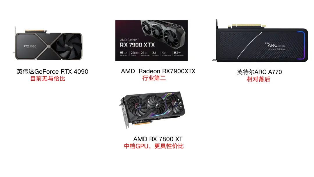 就性能而言,GeForce RTX 4090目前无与伦比。虽然AMD的Radeon RX 7900XTX位居第二,但相对滞后。AMD在性价比方面更具优势,例如RX 7800 XT可能是最佳的中档GPU,而且其产品通常在能源效率方面更高。相比之下,英特尔的ARC A770在这一市场中明显处于较远的落后位置。